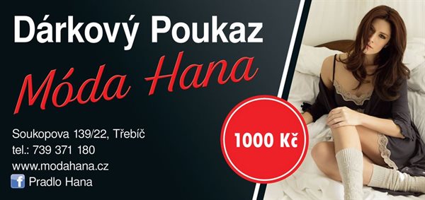Móda Hana nabízí dárkové poukazy v hodnotách 500 Kč, 1000 Kč, 1500 Kč a 2000 Kč. Na ně je možné čerpat veškeré zboží z prodejny, popřípadě doplatit rozdíl jak v hotovosti, tak platební kartou.